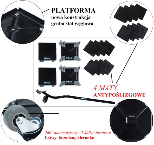 KOŁA - Każda platforma posiada 4 koła. Wykonany jest z wysokiej jakości gumy.