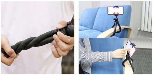 Statyw został wyposażony w elastyczne nogi, które można wygiąć nawet pod kątem 360°. Dzięki temu statyw możesz ustawić stabilnie nawet na krzywej powierzchni, a dodatkowo możesz zamocować go w nietypowych miejscach, np. poręczy czy gałęzi.