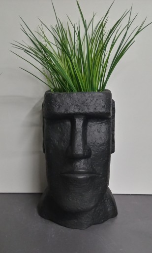 Doniczka -osłonka Moai z Wysp Wielkanocnych.Wysokość 24cm.Materiał:konglomerat kamienno-cementowy.Kolor czarny.Osłonki posiadają stopki filcowe.Na następnej aukcji dostępny Moai 16 i 28cm.Sprzedaż samej osłonki bez dodatków.Podesty ekspozycyjne dostępne na innej aukcji.
