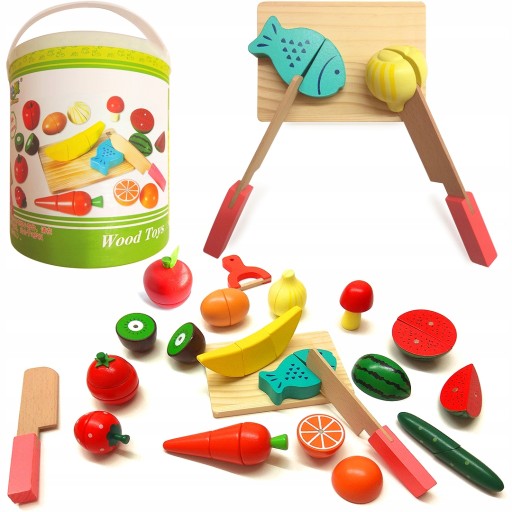 - W komplecie: warzywa (cebula, ogórek, marchewka, pomidor), owoce (truskawka, pomarańcza, kiwi, arbuz, jabłko, banan), pozostałe (ryba, jajo, grzybek), przyrządy kuchenne (deska do krojenia, 2 noże, obieraczka)