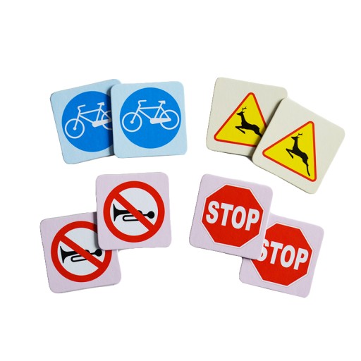 - 80 kartoników pogrupowanych w pary, mające na jednej stronie takie same obrazki w parze. Jest więc 40 par i 40 różnych obrazków przedstawiających znaki drogowe.