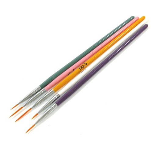 Zestaw zawiera 5 pędzli igłowych do zdobienia paznokci. Włosie syntetyczne, trzonek z drewna lakierowanego. Pędzelki można użyć do farbek akrylowych, kolorowych żeli.