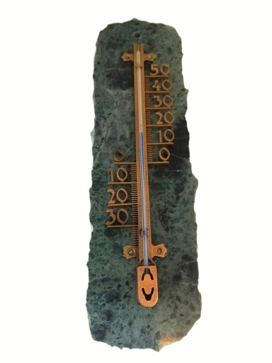 Termometr wykonany jest z zielonego kamienia, który wydobywany jest tylko w jednym miejscu w Polsce: w Nasławicach u podnóża Masywu Ślęży.