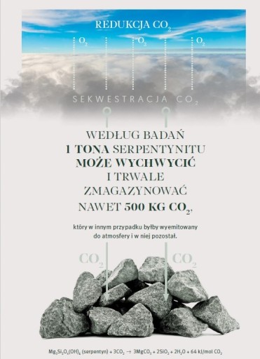 Serpentynit przyczynia się do utrzymania równowagi ekologicznej naszej planety. Jak to działa? Zachodzi w nim naturalne zjawisko wychwytywania i bezpiecznego unieszkodliwiania CO2. Proces ten nosi nazwę naturalnej sekwestracji dwutlenku węgla. Ten naturalny proces możliwy jest dzięki temu, że serpentynit jest skałą niezwykle bogatą w tlenki magnezu i wapnia, na których opiera się zjawisko oczyszczania powietrza z CO2.