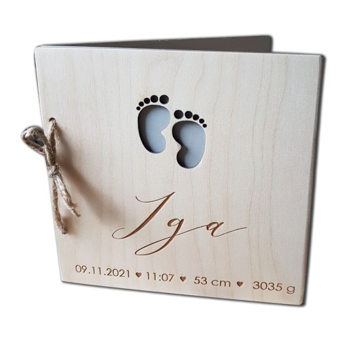 Ramka jest wykonana z drewna, grawerowana. Wymiary jednej części: 17x17 cm. Połączone sznureczkiem jutowym.