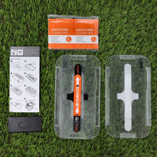 Opakowanie zawiera 2 sztuki szkła hartowanego Spigen Glas.tr EZ Fit oraz zestaw aplikacyjny w którego skład wchodzą: