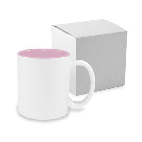 Biały kubek ceramiczny z różowym wnętrzem, klasy A+ powlekany warstwą poliestru do wykonywania nadruków w technologii sublimacji z kartonikiem. Możliwość zakupu od jednej sztuki.