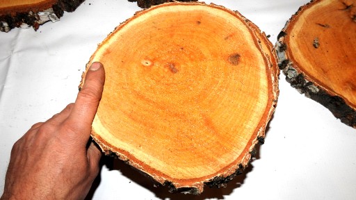 Powierzchnia plastrów nie jest szlifowana i posiada oryginalna strukturę po cięciu .Uwaga Plastry wymagają wysuszenia bo są świeżo cięte .Nieprawidłowe suszenie lub jego brak ,pozostawienie plastrów w wilgotnym otoczeniu powoduje ich pleśnienie! Dotyczy plastrów świeżych jak i suszonych .Najlepiej zapewnić każdemu plastrowi przepływ powietrza to pozwoli na delikatne suszenie i zapobiegnie nadmiernemu pękaniu drewna -im wolniej suszymy tym mniej pęknięć .Pęknięcia pojawiają się często bo drewno cięte w poprzek słoi ma takie tendencje .