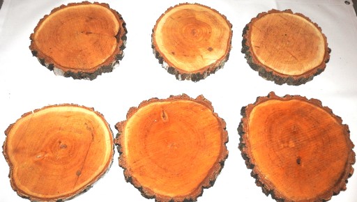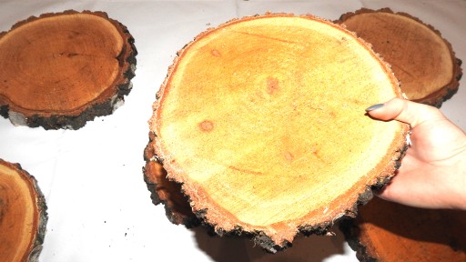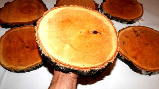 Powierzchnia plastrów nie jest szlifowana i posiada oryginalna strukturę po cięciu .Uwaga Plastry wymagają wysuszenia bo są świeżo cięte .Nieprawidłowe suszenie lub jego brak ,pozostawienie plastrów w wilgotnym otoczeniu powoduje ich pleśnienie! Dotyczy plastrów świeżych jak i suszonych .Najlepiej zapewnić każdemu plastrowi przepływ powietrza to pozwoli na delikatne suszenie i zapobiegnie nadmiernemu pękaniu drewna -im wolniej suszymy tym mniej pęknięć .Pęknięcia pojawiają się często bo drewno cięte w poprzek słoi ma takie tendencje .
