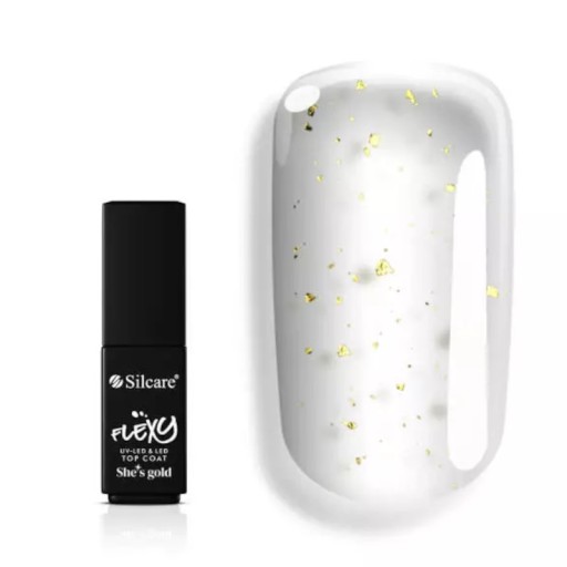 Flexy She’s Gold UV-LED & LED Top Coat to przezroczysty top z błyszczącymi złotymi drobinami. Preparat nie tylko zapewnia intensywny połysk, ale także doskonale zabezpiecza stylizację. Zastosowanie topu dodaje subtelnego efektu glamour każdemu manicure.