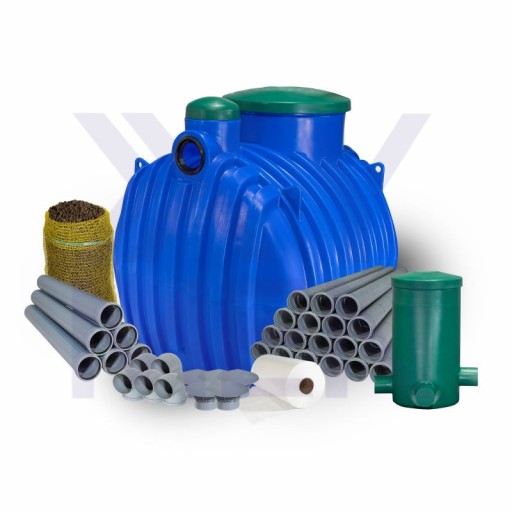 Zbiornik 2000l zwany osadnikiem gnilnym w którym zachodzi większość procesów oczyszczania w ekologicznych oczyszczalniach ścieków. Za pomocą procesów sedymentacji i flotacji cząstki stałe, lżejsze od ścieków wypływają na powierzchnię tworząc kożuch, cząstki cięższe od ścieków odkładają się na dnie zbiornika i tworzą osad. Osad ten ulega powolnemu procesowi fermentacji dzięki bakteriom beztlenowym. Cząstki zanieczyszczeń są rozkładane na substancje rozpuszczalne w wodzie oraz nierozpuszczalne substancje mineralne. Następnie, poprzez podniesienie poziomu ścieków w osadniku, zostaje wymuszony przepływ przez filtr keramzytowy, który gwarantuje separację zanieczyszczeń floatujących. Kolejnym etapem oczyszczania ścieków jest drenaż rozsączający, gdzie następuje biologiczne doczyszczanie ścieków. Jest to możliwe dzięki natlenieniu powierzchni płynących ścieków poprzez system wentylacji niskiej, który znajduję się na końcu każdej nitki drenażowej. Dzięki prostym zjawiskom fizycznym część powietrza z rur drenażowych zaczyna rozpuszczać się w ściekach podczyszczonych, co umożliwia wzrost flory bakteryjnej tlenowej. Tak oczyszczone ścieki trafiają do gruntu i następuje ich rozsączanie.