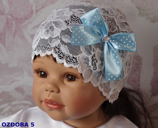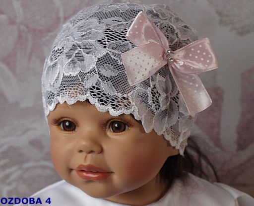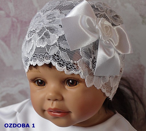 Mamy zaszczyt zaprezentować Państwu śliczną czapeczkę pochodzącą naszej pracowni. Czapeczka wykonana jest z białej elastycznej koronki więc bardzo łatwo dopasowuje się do główki dziecka .Jest niezwykle elegancka posiada ręcznie wykonaną ozdobę może stanowić uzupełnienie sukienek z naszej kolekcji
