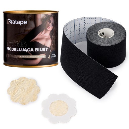 - TAŚMA MODELUJĄCA PIERSI BRATAPE – pozwala Ci bez skrępowania nosić sukienki, bluzki czy kostiumy z głębokim dekoltem oraz bez pleców - unikając zakładania tradycyjnych biustonoszy. Jedna rolka to 5 metrów, doskonałej taśmy klasy medycznej z bezpiecznym hypoalergicznym klejem. Do zestawu dołączone zostały również koronkowe nasutniki, które pozwolą Ci chronić delikatna skórę na brodawkach przed podrażnieniem. Taśma wykonana została z bezpiecznych oddychających materiałów takich jak bawełna i spandex.