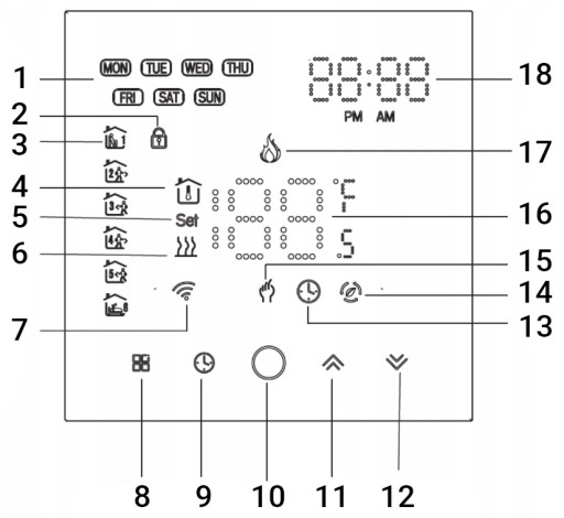 - 1x Termostat z ekranem z dotykowymi przyciskami