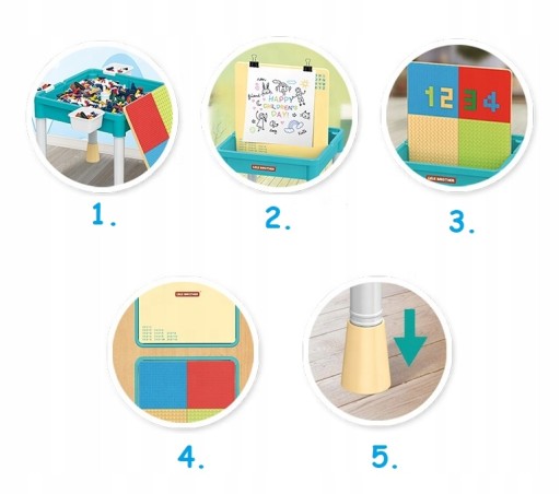 Blat jest dwustronny: z jednej strony gładki - do rysowania, pisania i malowania; zaś druga strona - została zaprojektowany tak, aby pasowała do wszystkich wiodących marek klocków konstrukcyjnych, umożliwiając dziecku maksymalne wykorzystanie tego wielofunkcyjnego stołu.(klocki nie są przedmiotem zakupu w zestawie z blatem)