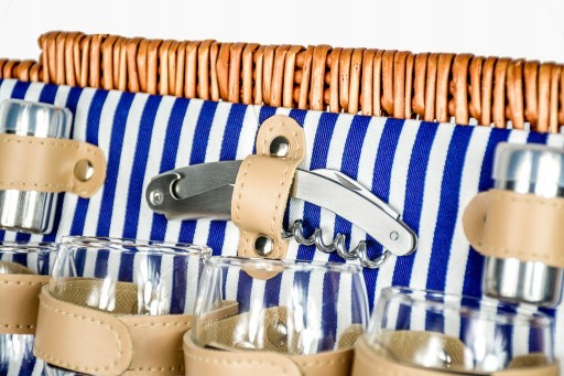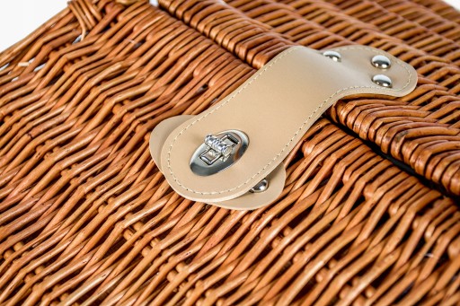 Jest nie tylko praktyczny, ale także stylowy. Biało niebieska bawełniana podszewka świetnie komponuje się z brązową wikliną, a zamki i uchwyty z brązowej ekoskóry, utrzymają wyposażenie na miejscu, dzięki czemu jest on niezawodny w podróży. Wysokiej jakości stalowe sztućce dodają elegancji.