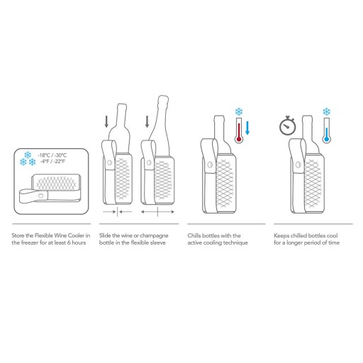 Przechowuj schładzacz do wina w zamrażarce przez co najmniej 6 godzin. Wsuń butelkę wina lub szampana do rękawa, lodowate elementy chłodzące wewnątrz mają bezpośredni kontakt z butelką, zapewniając optymalny efekt chłodzenia.
