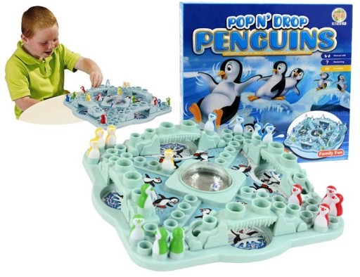 Gra pingwinki posiada plastikową planszę z czterema mostami, kostkę do gry oraz 16 pionków w 4 kolorach. Rozkładamy zestaw z umiejscowieniem mostów ”zwodzonych” w przeznaczonych dla nich miejscach. Pionki ułożone kolorystycznie czekają na swoją kolej. Start zaczyna ta osoba, która po naciśnięciu przeźroczystej półkuli umiejscowionej na środku planszy wyrzuci na kostce 6 oczek. Pionki poruszają się o ilość oczek wskazanych przez kostkę. Kiedy twój pionek stanie na ruchomej części „mostu” możesz zrzucić stojące na moście pionki przeciwnika. Zrzucone pionki wracają do pól startowych, aby móc ponownie wykonać nimi ruch należy na kostce wyrzucić 6 oczek. Aby zwyciężyć wyścig należy obejść całą planszę i ustawić bezpiecznie na mecie wszystkie swoje pionki.