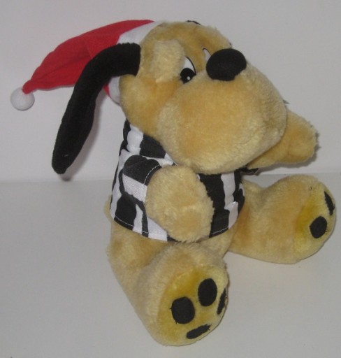 Bożonarodzeniowa maskotka w barwach Juve. Rozmiar: wysokość 21 cm. Używana. Stan jak na zdjęciach - drobne rozdarcie na koszulce od frontu - zaznaczone kółkiem. Z Włoch. Cena za 1 szt.