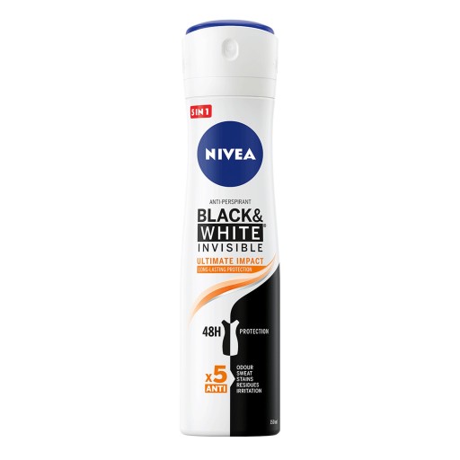 NIVEA Antyperspirant Black & White Invisible Ultimate Protect to produkt opracowany we współpracy z ekspertami z dziedziny tekstyliów, by zapewnić Ci mocną i niezawodną ochronę przed poceniem się, bez ryzyka pobrudzenia ubrań. Antyperspirant ma nowy, świeży zapach, który zapewnia długotrwałe uczucie świeżości i czystości. Nie pozostawia żółtych plam na białych ubraniach ani białych śladów na czarnych ubraniach. Nie zawiera alkoholu etylowego, a jego łagodność dla skóry została potwierdzona dermatologicznie. Wygodna forma aplikacji w sprayu. Unikalna formuła chroni Cię przed nadmiernym poceniem się przez 48 godzin i pomaga zachować pierwotny kolor ubrań.
