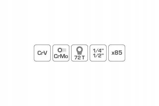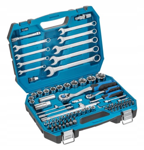 Zestaw 85 elementów ,składa się z kluczy płaskich nasadek, końcówek wkrętakowych i 1/4” i 1/2”,
