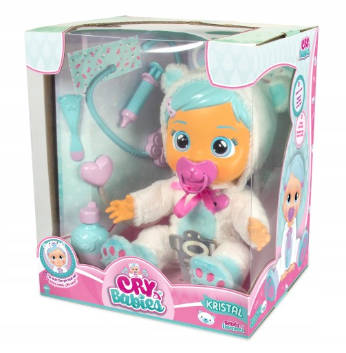 Śliczne bobaski Cry Babies potrzebują kogoś, kto je pokocha! Przytul je i daj im smoczek, a od razu się uspokoją. Cry Babies płaczą prawdziwymi łzami, wydając przy tym autentyczne odgłosy płaczącego malucha. Aby laleczka zaczęła płakać, wystarczy wlać wodę do specjalnego pojemnika, umieszczonego z tyłu jej głowy i nacisnąć przycisk. Gdy chcesz ją uspokoić, by przestała płakać włóż smoczek do jej buzi. Gdy serduszko Kristal bije szybciej to znaczy, że jest chora, a Ty możesz sprawić, że poczujesz się lepiej. Gdy na twarzy wyjdą jej czerwone krostki, daj jej zastrzyk! W razie gorączki otrzyj jej czoło wilgotną chusteczką. Lalka uczy małe dziewczynki odpowiedzialności i opieki.