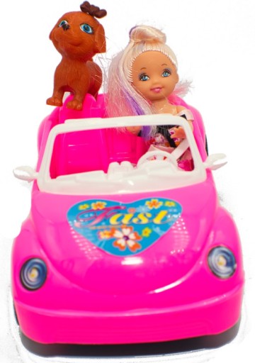 Idealny zestaw dla małej dziewczynki składający się z lalki, dwumiejscowego samochodu dla lalek w kolorze różowym oraz towarzysza lalki - pieska.