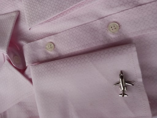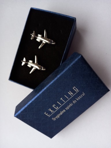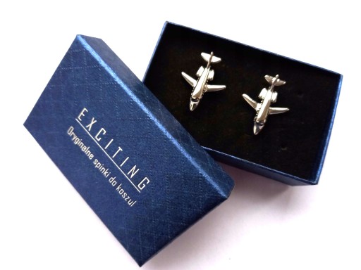 Zestaw spinek do mankietów koszuli marki Exciting. Spinki zostały wykonane z metalu szlachetnego w postaci małych samolocików typu awionetka Embraer w kolorze srebrnym. Zestaw dwóch spinek jest zapakowany w czarne lub niebieskie kartonowe pudełko. Za dopłatą możemy zapakować spinki w ekskluzywne etui z wzorem skóry węża pokazane na dalszych zdjęciach. Idealne na prezent dla pilota, lotnika i miłośnika awiacji, lotnictwa. Na innej aukcji mamy także ten model w kolorze złotym.