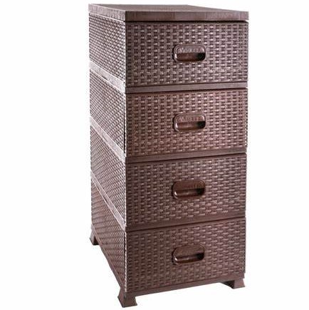 - Komoda wykonana z wysokiej jakości tworzywa sztucznego o wzorze RATTANU,- Solidny i łatwy w utrzymaniu czystości,- Posiada 4 szuflady z blokadą zabezpieczającą przed wypadnięciem,- Produkt europejski,- Doskonale pasuje do salonu, kuchni, łazienki oraz pokoju dziecięcego. - Produkt łatwy w montażu, bez użycia jakichkolwiek narzędzi.