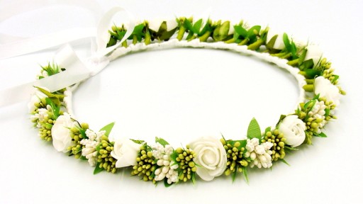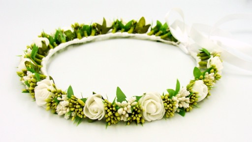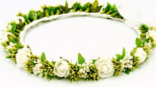 Wianek spleciony z białych różyczek piankowych, ozdobiony białymi i zielonymi szyszeczkami.