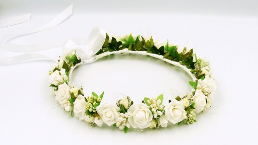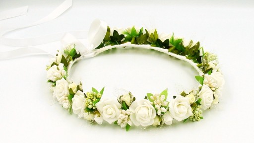 Wianek spleciony z różyczek piankowych, w tonacji bieli i zieleni.