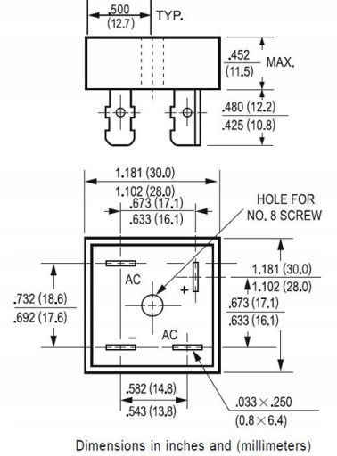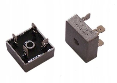 Mostek prostowniczy, maksymalne napięcie pracy 1000 V, prąd do 50 A. Posiada wyprowadzenia w postaci konektorów.