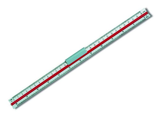 Precyzyjna skalówka trójkątna, wykonana z białego tworzywa sztucznego, posiada kolorowe oznaczenia stron i 6 precyzyjnych skal do różnych zastosowań.