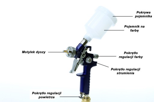 Wysokiej jakości pistolet lakierniczy wyposażony w trzy regulacje: powietrza, farby i strumienia.Pistolet zaopatrzony jest w niezależny mechanizm uruchamiania powietrza i farby. Dzięki takiemu rozwiązaniu po lekkim naciśnięciu spustu z dyszy wydostaje się sprężone powietrze, a następnie po zwiększeniu nacisku na spust farba. Ma to duży wpływ na na jakość malowania.