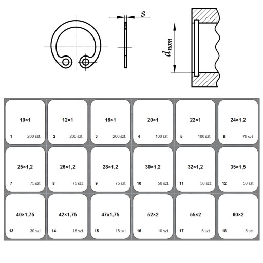 Pierścienie osadcze sprężynujące wewnętrzne w/g DIN 472 w poręcznej metalowej kasecie, co jest idealnym rozwiązaniem w przypadku zapotrzebowania większej ilości pozycji asortymentowych w jednym opakowaniu. Rozwiązanie to jest szczególnie przydatne w warsztatach naprawczych, serwisach czy w sprzedaży detalicznej. Towar w kasecie jest umieszczony w gniazdach i posegregowany według wielkości, co umożliwia jego szybkie i wygodne zlokalizowanie.