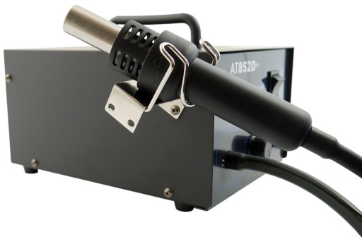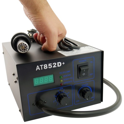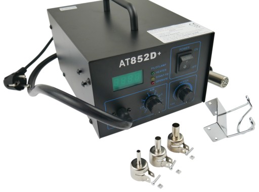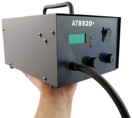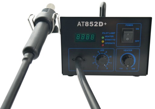 ✅ Na przednim panelu spawarki znajduje się wyświetlacz LED, na którym wyświetla się temperatura pracy. Znajdziemy tam również pokrętło od zmiany wysokości temperatury oraz siłę wydmuchu. Powyżej przełącznik od włączenia / wyłączenia spawarki.