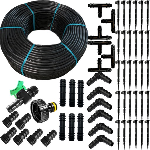 ⏩ Zestaw zawiera linię kroplującą oraz 56 pełnych elementów montażowych, które pozwolą Ci skutecznie nawodnić Twoją uprawę.