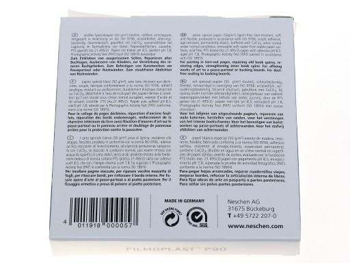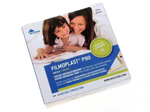 Opis produktu: Taśma jednostronnie klejąca odporna na starzenie, bezkwasowa - odklejalna w zależności od podłoża - do sklejania starych kart książek, ich naprawy i wzmocnienia, przytwierdzania zdjęć, rysunków, grafik itp. do passepartouts itd. Odklejenie taśmy, jeśli byłoby to kiedykolwiek potrzebne, może się zakończyć powodzeniem lub nie z powodu np. przylepności podłoża, mocy dociskania przyklejonej taśmy, chropowatości materiału... Podłoże papierowe jest białe, taśma P 90 nie jest tak przezroczysta jak Filmoplast P. Jest bezkwasowa, elastyczna i miękka, ma gęstości ok. 50g/m. kw. i pH od 7,8 do 8,8. Pudełko zawiera rolkę 2cmx50m, podłoże jest zbuforowane węglanem wapnia i tworzy rezerwą zasadową. Rolka znajduje się w poręcznym pudełeczku, który pomaga oderwać zadany kawałek taśmy. Filmoplast P 90 to wyrób niemieckiego producenta, numer katalogowy 25454, posiada atest PAT. Oferujemy inne bezkwasowe taśmy klejące używane w fotografii.