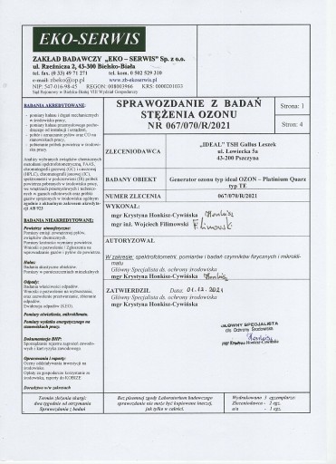- firma zapewnia dożywotnie, prawidłowe działanie generatora ozonu/ozonatora, przy pogwarancyjnych, corocznych przeglądach odpłatnych/ czyszczenie, test