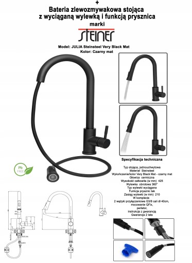 - BATERIA ZLEWOZMYWAKOWA STOJĄCA Z WYCIĄGANĄ WYLEWKĄ 2 STRUMIENIOWĄ STEINER JULIA VERY BLACK W KOLORZE CZARNY MAT