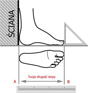 - Zapisz wynik pomiaru, następnie dodaj do niego 3-5 mm (aby obuwie było wygodne, umieszczona w obuwiu wkładka powinna być dłuższa od stopy o 3-5 mm).