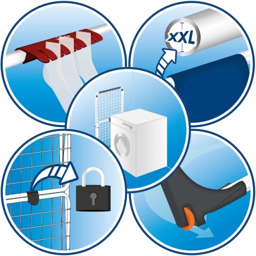 Wyposażenie: Suszarka na pranie posiada blokadę skrzydeł dla łatwiejszego przechowywania.