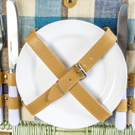Kosz wyposażony jest w klamrę z zapięciem oraz skórzany (ekoskóra) uchwyt ułatwiający transport. Wewnątrz kosz wyłożony jest pięknym materiałem, zapewniającym szczelność i poprawiającym estetykę. Dodatkowo wewnątrz kosz posiada mocowania zabezpieczające zastawę podczas transportu.