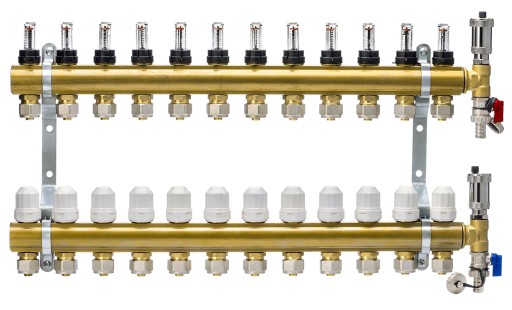 Rozdzielacze kierują czynnik grzewczy na poszczególne pętle ogrzewania podłogowego W naszej ofercie znajdują się zestawy dedykowane zarówno do ogrzewania podłogowego jak i do instalacji z grzejnikami – z belkami wykonanymi z mosiądzu lub stali nierdzewnej. Niezbędnym wyposażeniem rozdzielacza do ogrzewania podłogowego są przepływomierze, za pomocą których dokonuje się równoważenia hydraulicznego instalacji tj. wyrównania przepływów na poszczególnych pętlach. Najwyższej jakości rotametry zastosowane w rozdzielaczach pozwalają na odczyt przepływu a także jego regulacje oraz całkowite zamknięcie danej pętli. Kolejnym elementem rozdzielacza niezbędnym przy ogrzewaniu płaszczyznowym są zawory termostatyczne na belce powrotnej – z pokrętłami do operacji manualnej oraz możliwością instalacji głowicy termoelektrycznej o standardowym przyłączu M30x1,5 w celu zastosowania elektronicznego systemu sterowania ogrzewaniem.