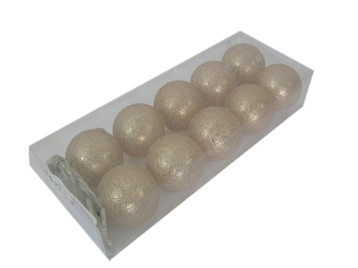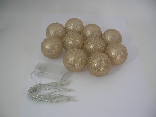 Przedmiotem oferty jest komplet 10 sztuk kul w kolorze szampańskim. Sznur kul przepięknie będzie prezentował się zarówno w sypialni jak i będzie stanowić fajny element dekoracyjny. Kule zasilane są bateriami typu AA - 2 sztuki. Baterie nie są w komplecie.