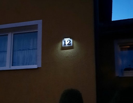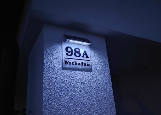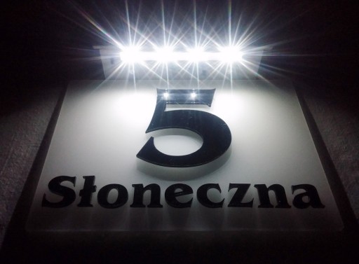 Tabliczka zaopatrzona jest w moduł z baterią słoneczną, więc jest ładnie podświetlona w nocy diodami LED i nie wymaga zasilania przez kabel.