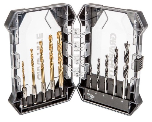 Zestaw wierteł 10 szt. uchwyt sześciokątny - HSS 3, 4, 5, 6, 8 mm, do drewna 3, 4, 5, 6, 8 mm 55H205 GRAPHITE - Uniwersalny i wytrzymały zestaw wierteł do drewna i metalu TOPEX GRAPHITE jest idealnym akcesorium dla każdej wkrętarki i wiertarki. Wysokiej jakości wykonanie czterech ostrzy na czubku wiertła pozwala na szybkie i skuteczne wyprowadzanie urobku, dzięki czemu można uniknąć ewentualnych zacięć lub złamań.