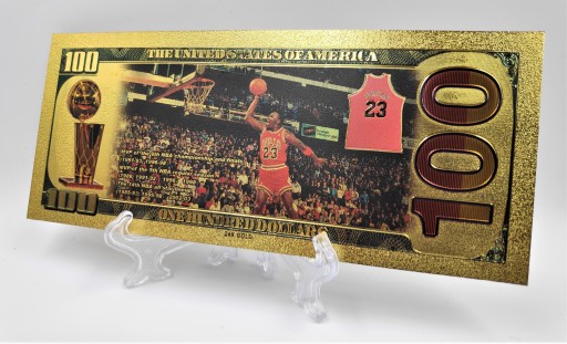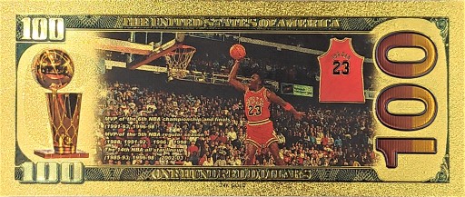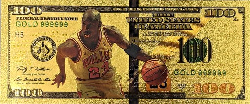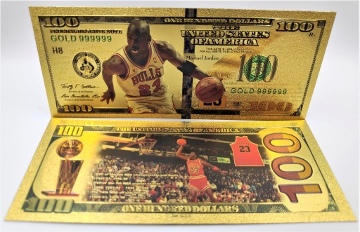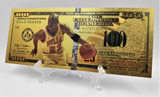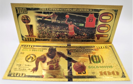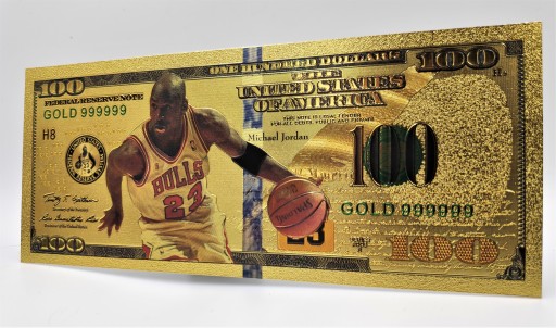 Oferuję na sprzedaż piękny pozłacany banknot kolekcjonerski z wizerunkiem Michaela Jordana.