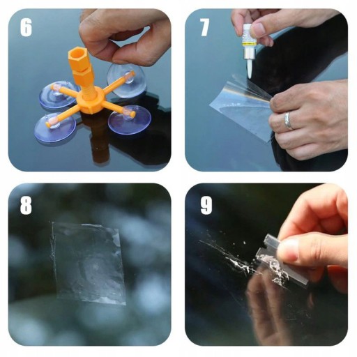 W skład zestawu wchodzi pojemnik z klejem, aplikator z przyssawkami, żyletka służąca do usuwania nadmiaru kleju, oraz folie zabezpieczające klej przed rozlaniem się. Szpary i rysy powstałe w wyniku pęknięć stają się prawie niewidoczne, a najważniejsza zaleta kleju to zatrzymanie dalszego pękania szyb przednich. Komplet nadaje się do wielorazowego użytku.