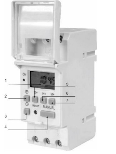 - Elektroniczny programator czasowy z wyświetlaczem LCD przystosowany do montażu na standardowej szynie DIN TH-35 mm.
